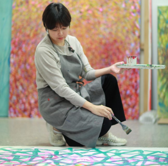 명상에 가까운 행위로 드러난다. 반복되는 붓질과 점의 축적은 즉흥적으로 보이지만, 그 이면에는 질서와 구조적 리듬이 작동한다. 통제와 우연, 자유와
